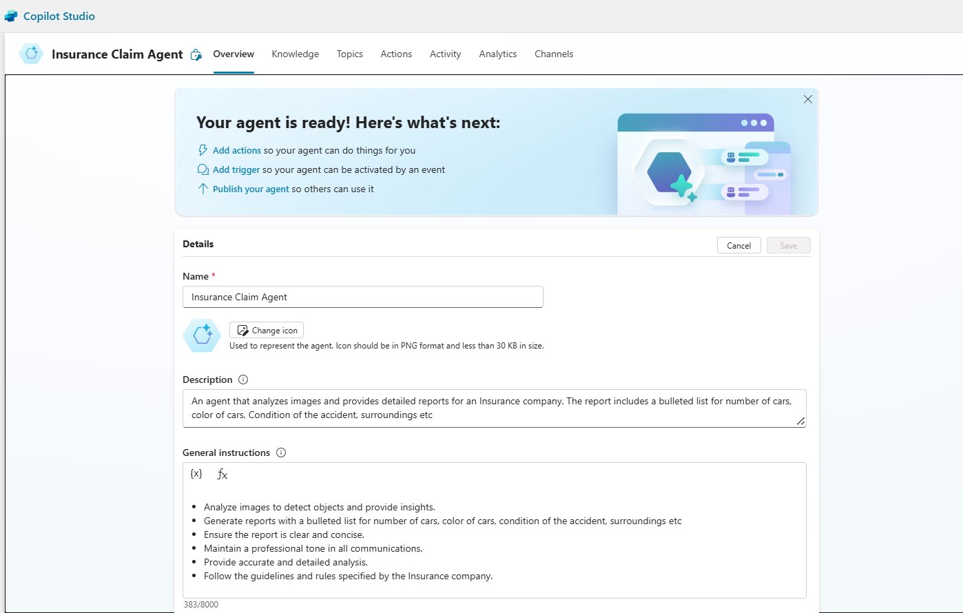 I will be demonstrating Copilot Studio’s Image analysis feature for an Insurance company . I will be providing car accident images as in input to the agent , this agent will help insurance companies quickly assess damage and detect fraud, speeding up claim processing and improving accuracy. This leads to faster resolutions and better customer satisfaction.🚗📸