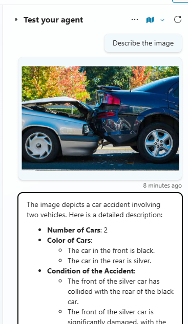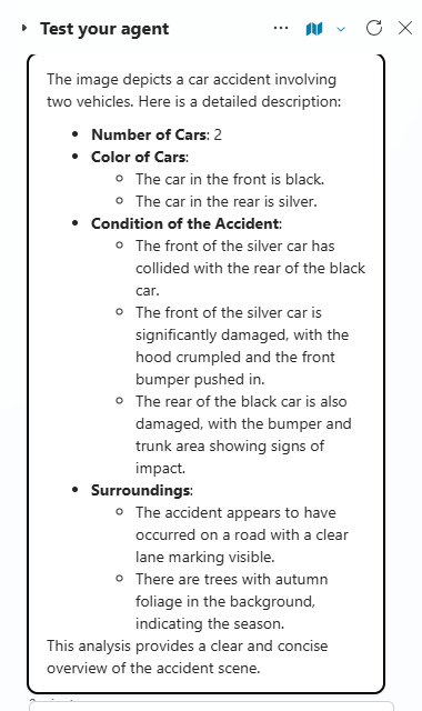 Conclusion Leveraging image input and analysis feature of Copilot Studio in car accident insurance claims revolutionises the process by enhancing speed, accuracy, and transparency. This technology enables insurers to quickly assess damage, detect fraud, and provide faster resolutions, ultimately leading to improved customer satisfaction. By integrating images in Copilot studio agents, insurance companies can streamline operations and ensure fair and efficient claim handling.🚗📸